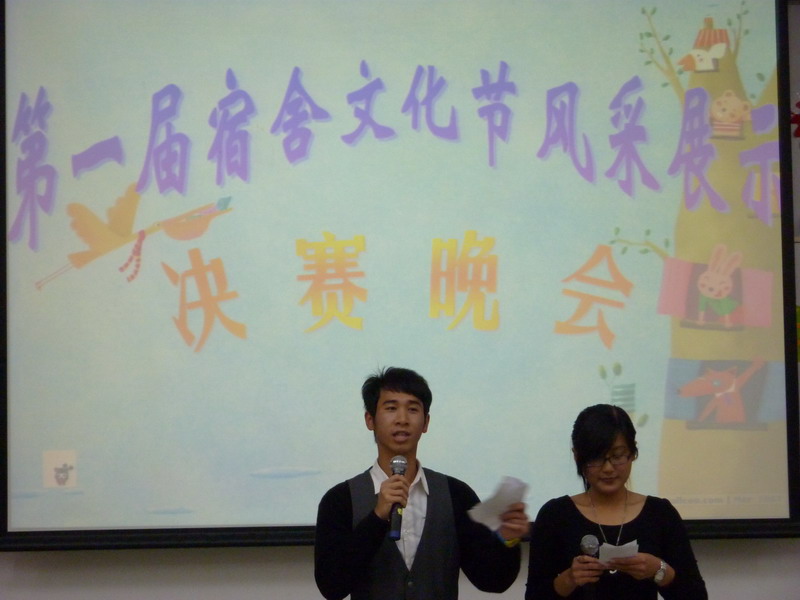 各个宿舍围绕“小空间,大创意,靓舞台,我做主”的主题展开精彩的表演。优美的歌声,充满创意的“梁祝”外传,悠扬的乐曲,帅气的舞蹈……精彩层出不穷。刘鸿燕在最后的总结提到,宿舍文化节促进了宿舍同学间的交流,嘱咐我们应珍惜时光、朋友。